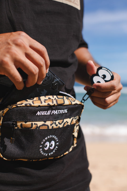 Niele Patrol Collab Jim Shorts with Aloha Exchange. The all around shorts that you will want to patrol in, cruise in, sleep in, swim in, surf in and scope the scene in. Custom Sheriff Cheetah print with Mustache and Aviator Shade Splotches. AX x Niele Patrol Logo embroidery, Elastic drawstring waist, front pockets, and a zippered back pocket.